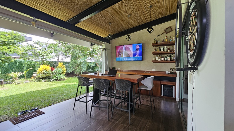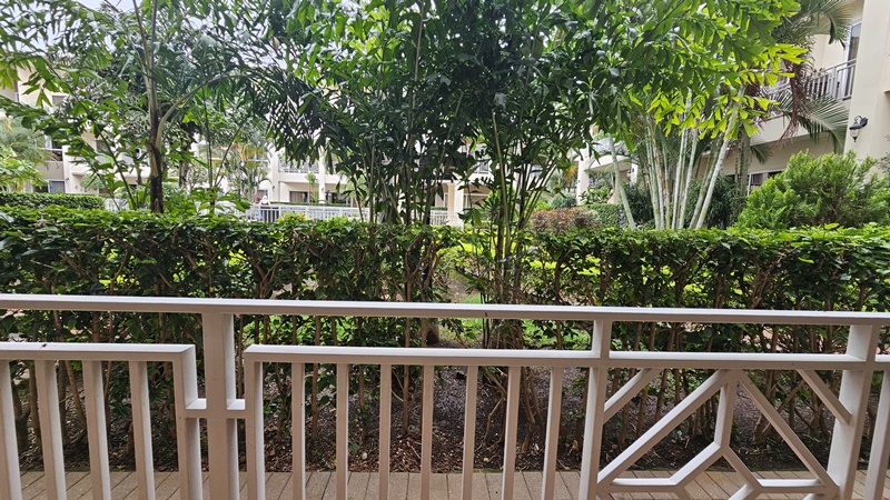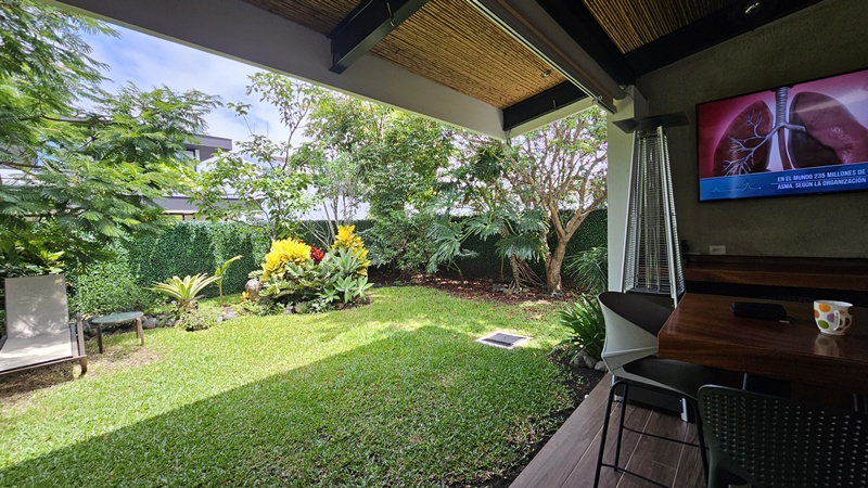 La terraza con una vista bella a los jardines. Salida directa a la piscina.