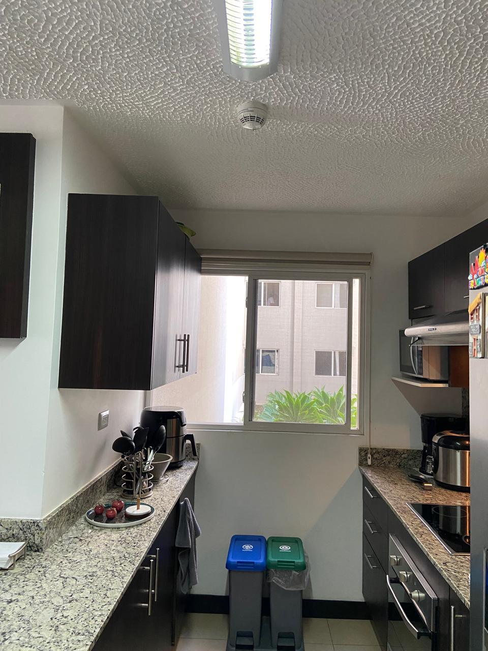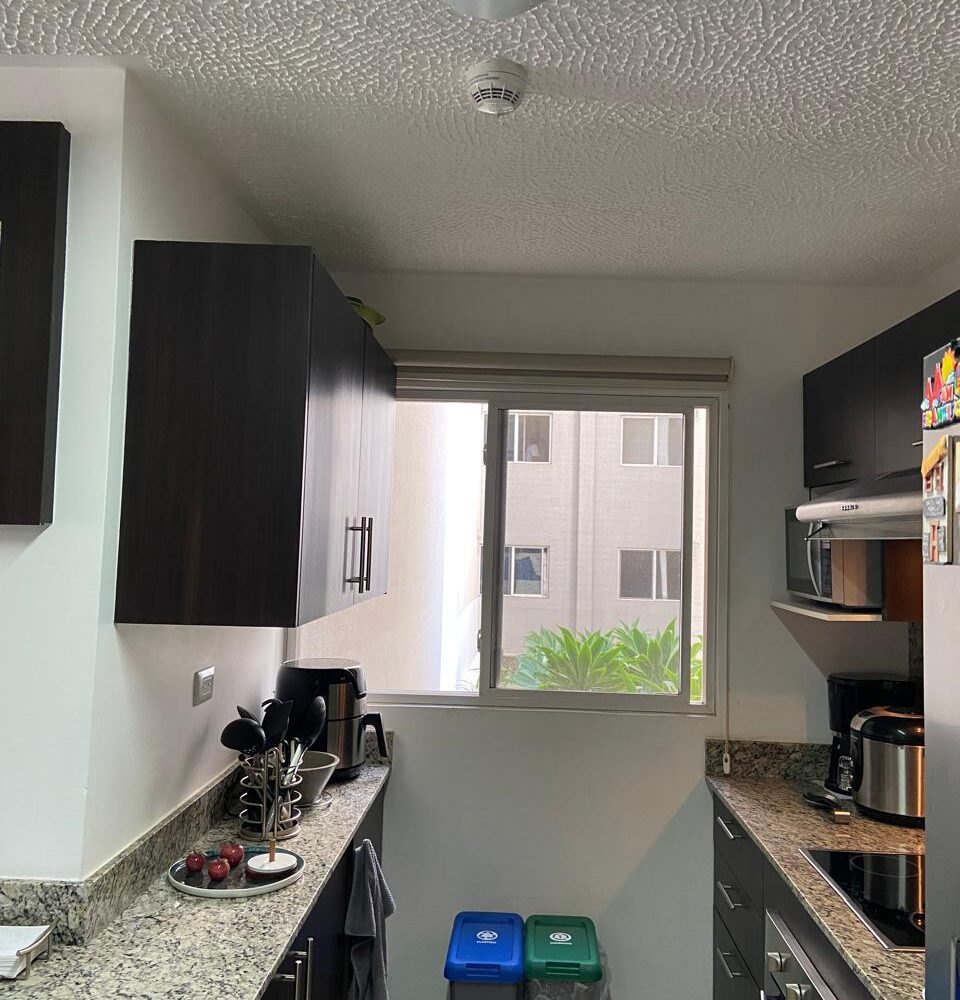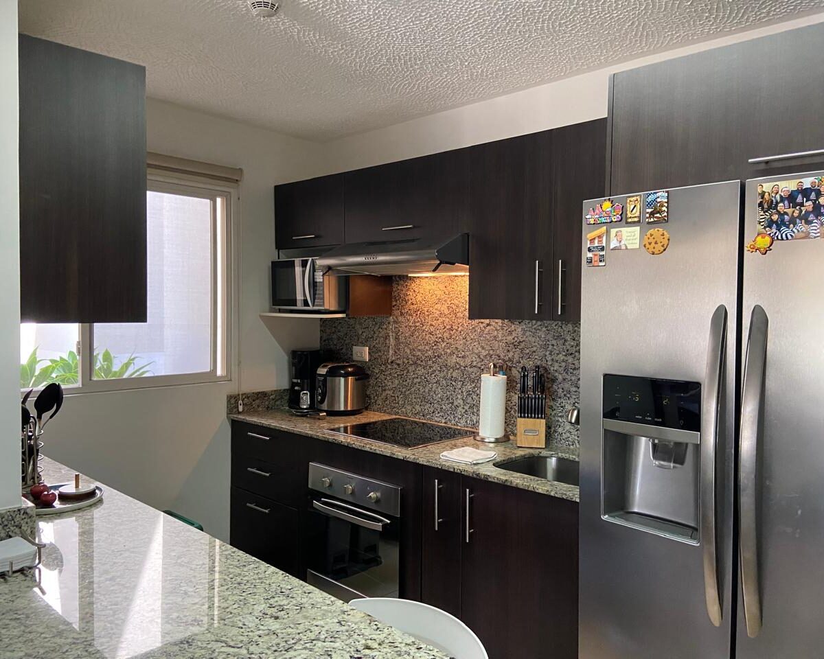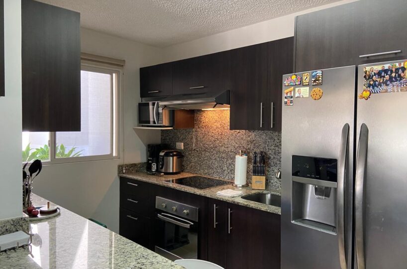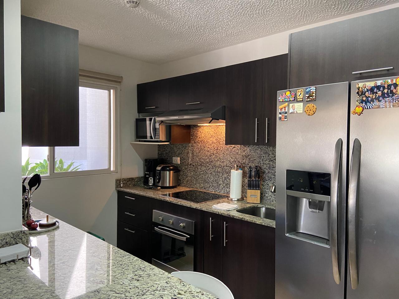 El apartamento posee una amplia área de sala comedor con una hermosa terraza y con cocina de concepto abierto que posee muebles y desayunador, estufa, horno y refrigerador empotrados y mucho espacio de almacenamiento, área de lavandería y dos espacios de parqueo.