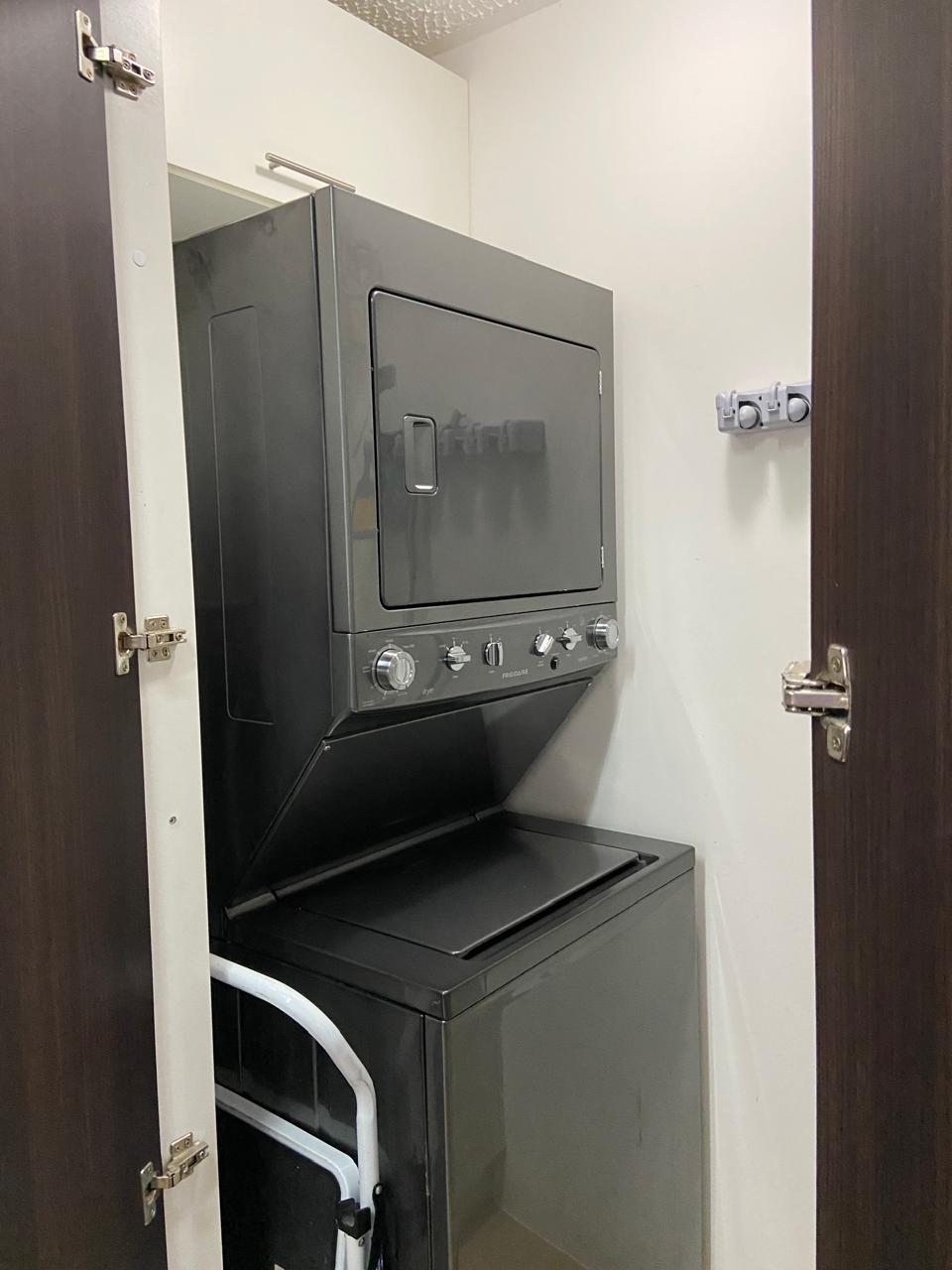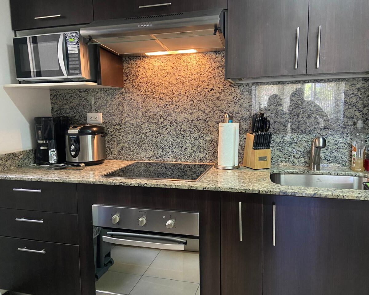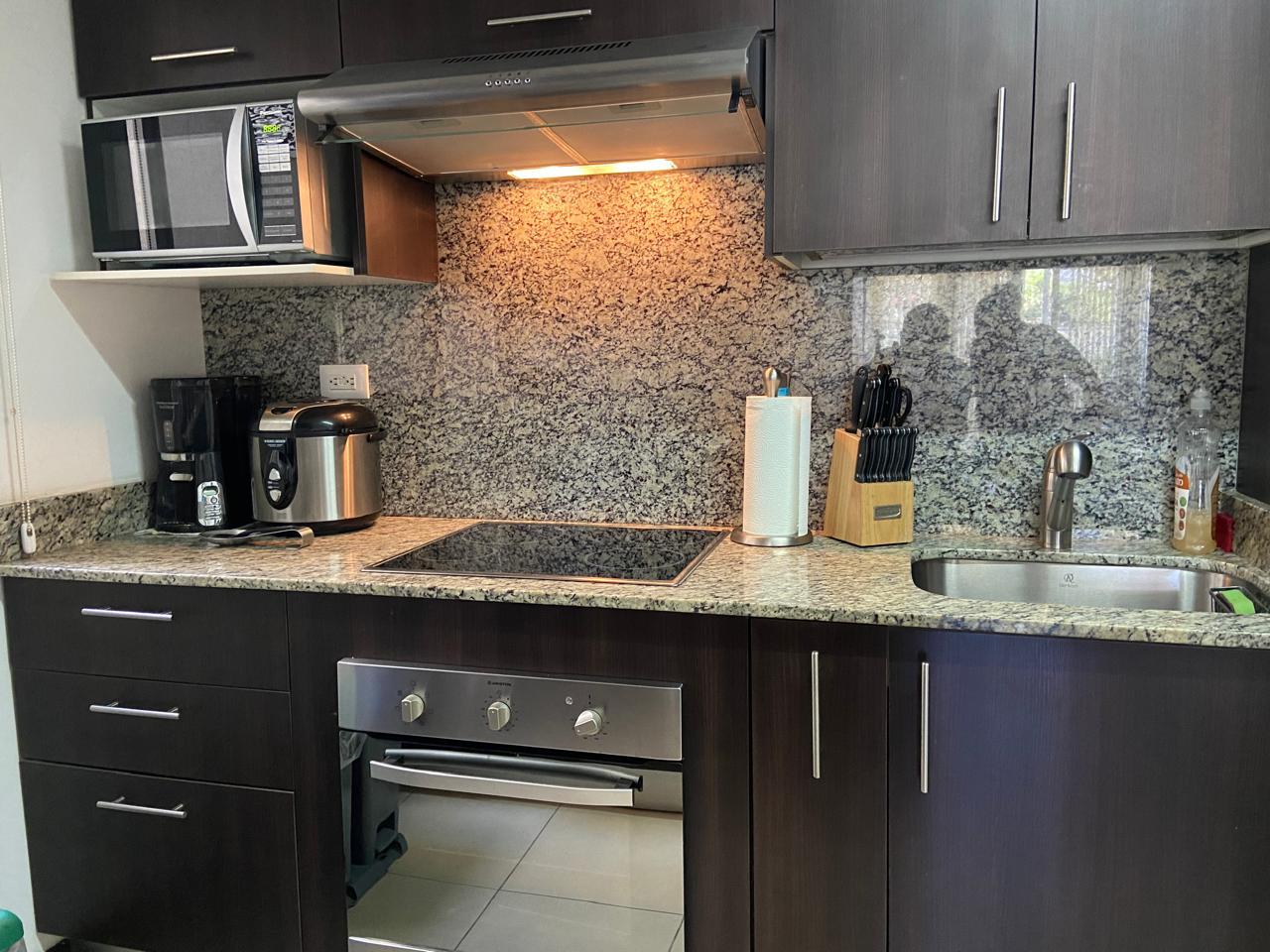 El apartamento posee una amplia área de sala comedor con una hermosa terraza y con cocina de concepto abierto que posee muebles y desayunador, estufa, horno y refrigerador empotrados y mucho espacio de almacenamiento, área de lavandería y dos espacios de parqueo.