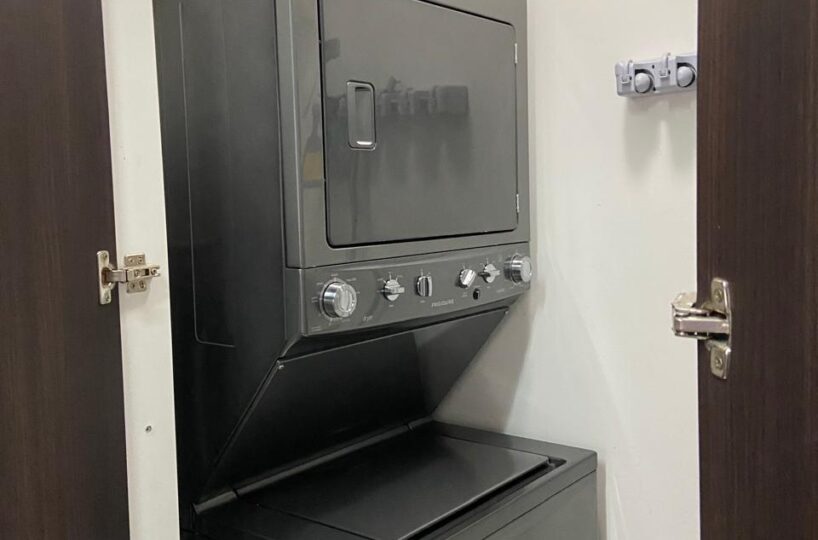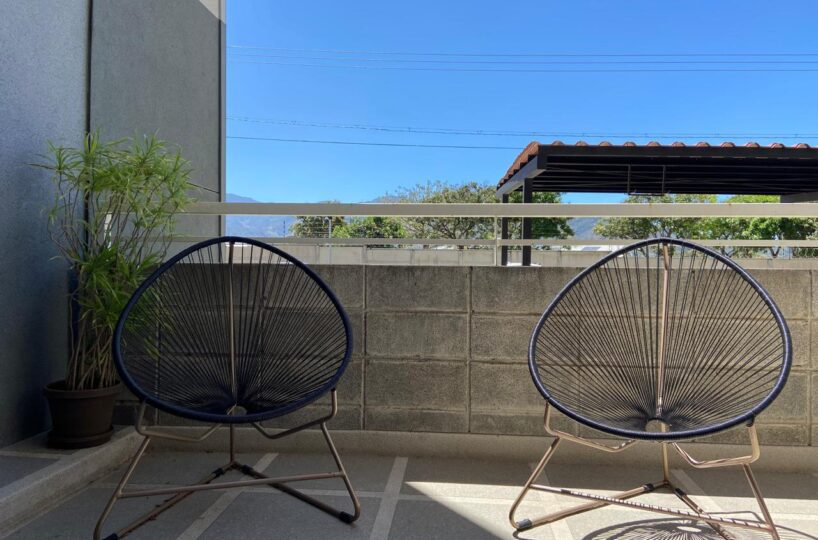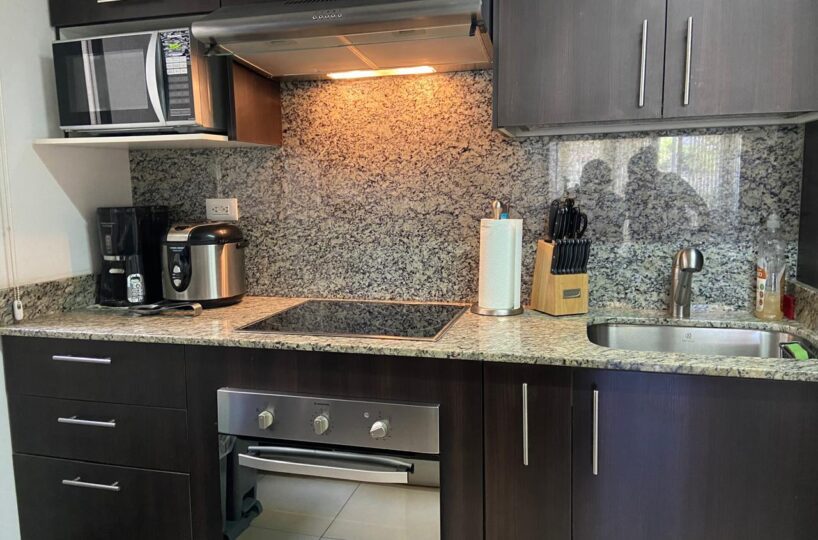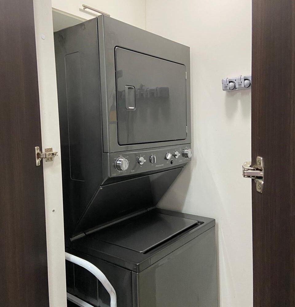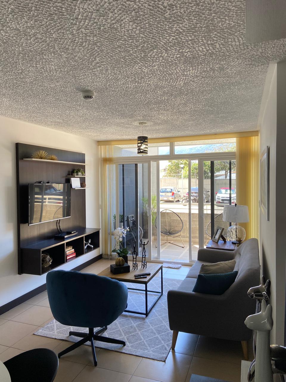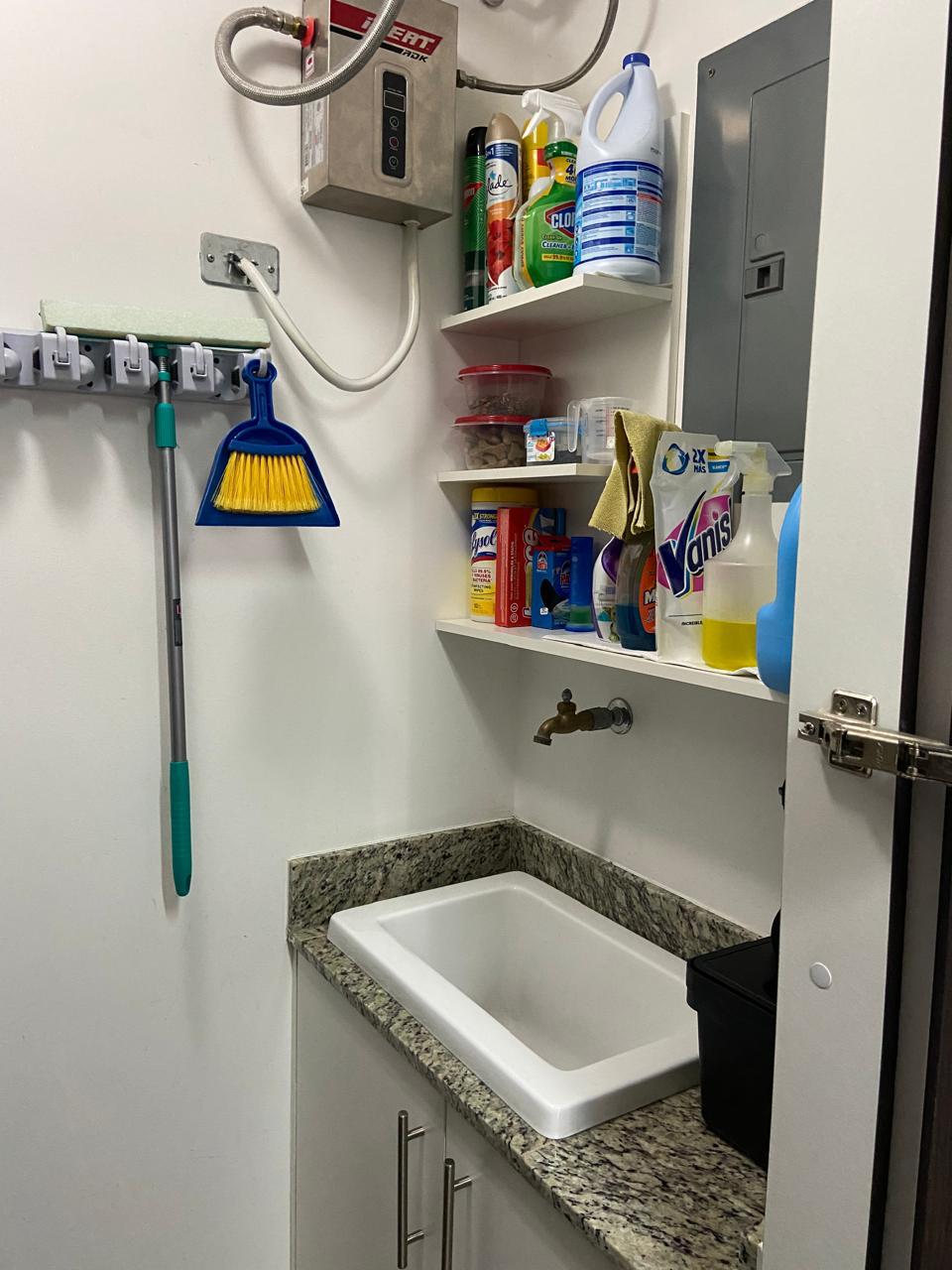 El apartamento posee una amplia área de sala comedor con una hermosa terraza y con cocina de concepto abierto que posee muebles y desayunador, estufa, horno y refrigerador empotrados y mucho espacio de almacenamiento, área de lavandería y dos espacios de parqueo.