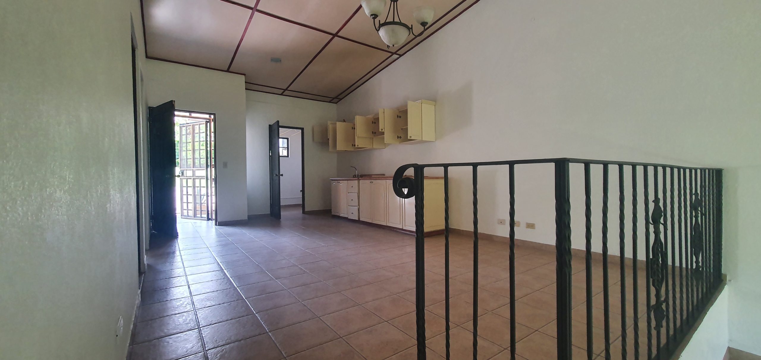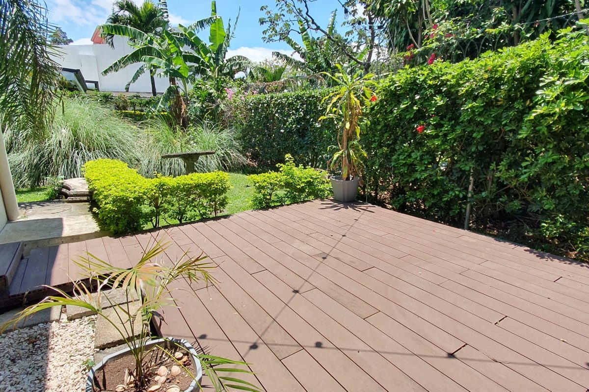 2 dormitorios amplios, 2 baños completos. Sala con vista a la terraza (deck) y el hermoso jardín, además de un Comedor con Cocina integrada. Lavandería con espacio de tendido.
