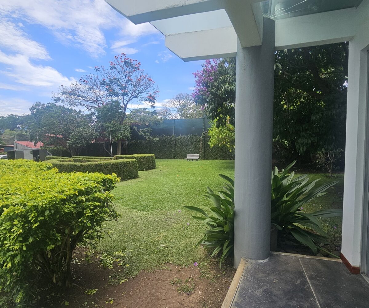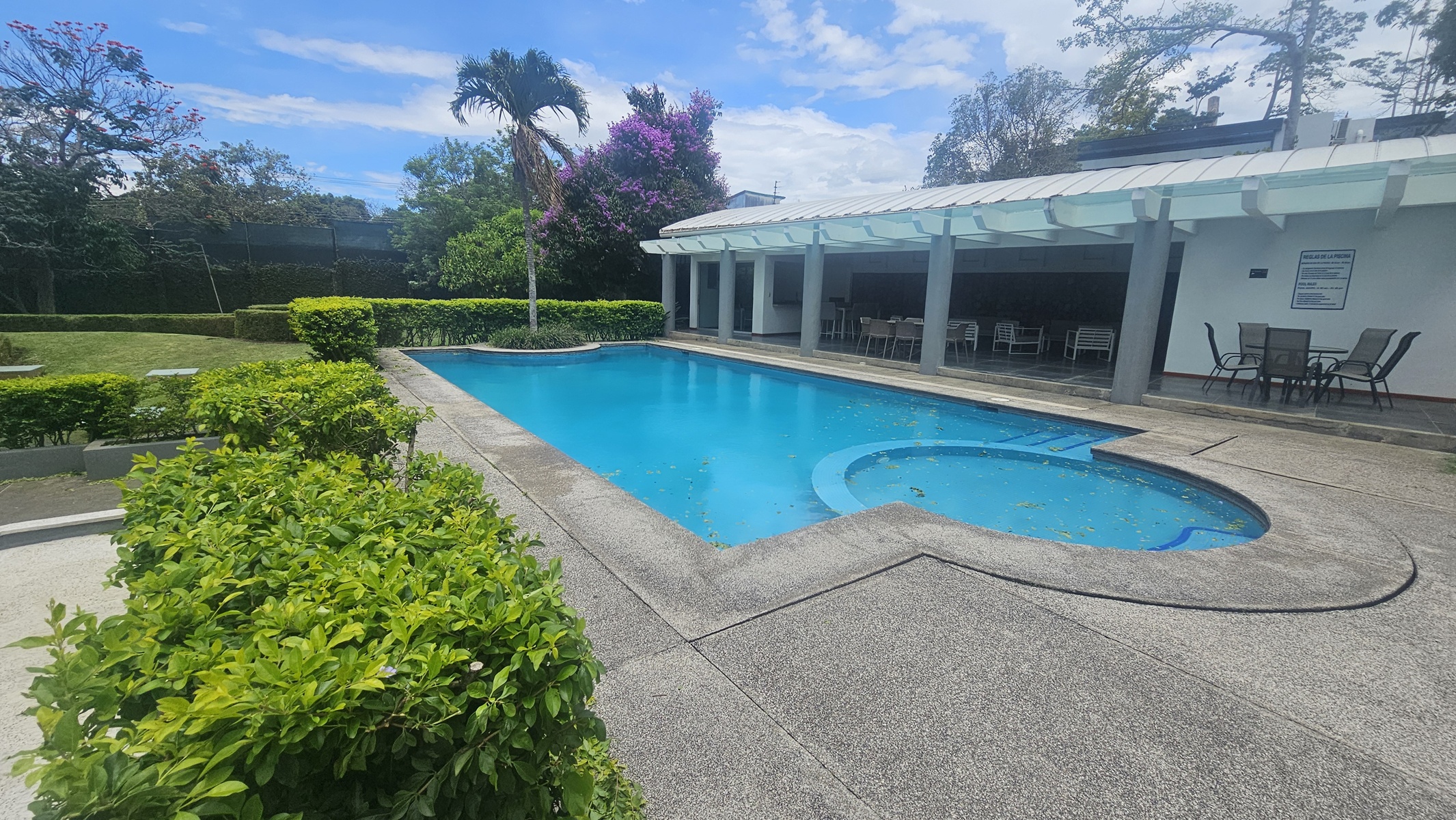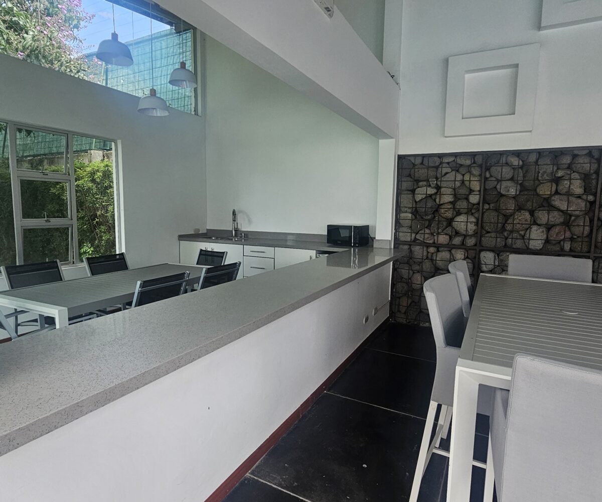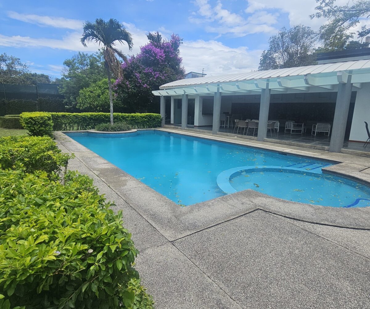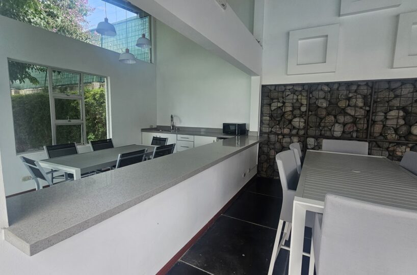 El área común muy cuidado. Una sabrosa piscina. Rancho de fiestas con zona de BBQ y área de trabajo.