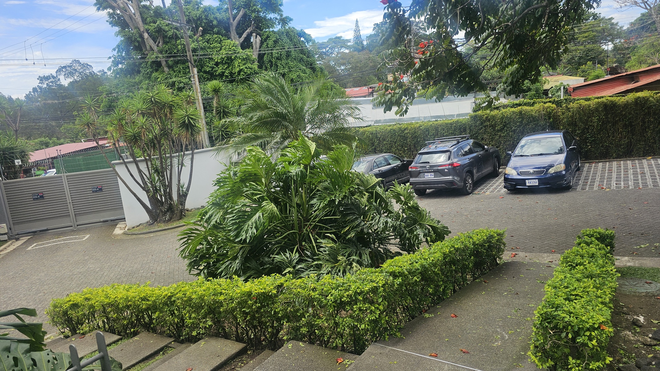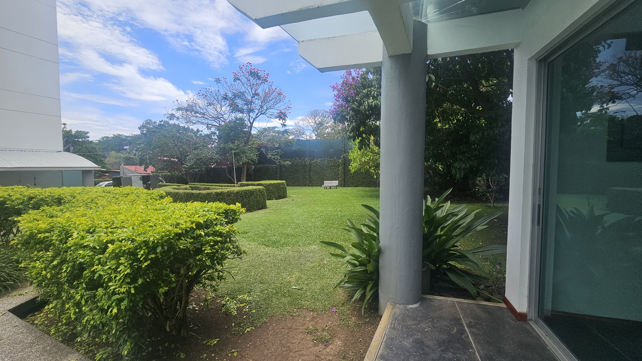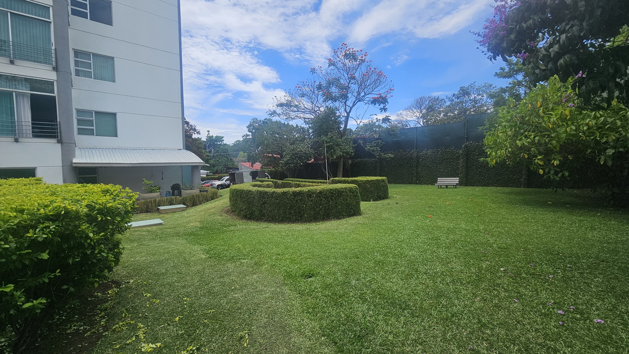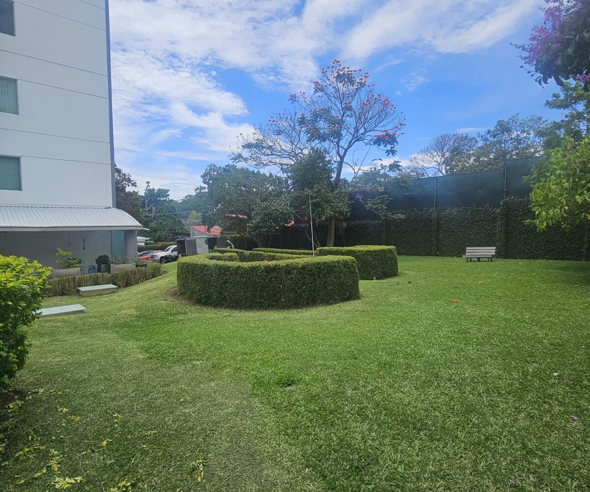 Las zonas verdes bellamente manicuradas y también un playground para los niños que habitan el condominio.