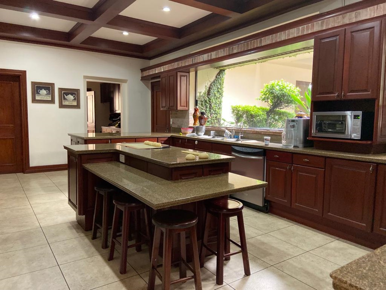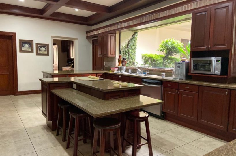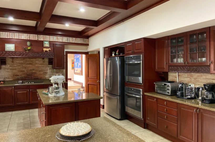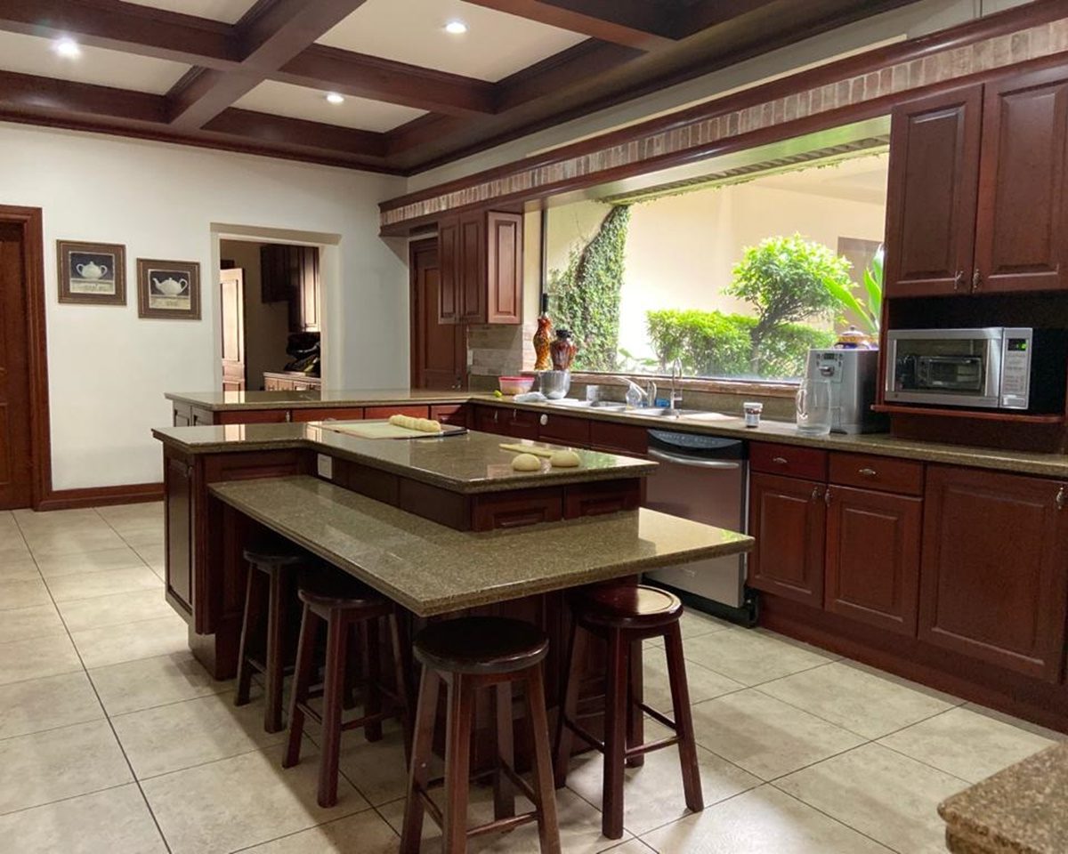 La cocina es independiente y muy amplia, clara y fresca y posee muebles finos de madera con sobres de granito, así como una isla, cava de vinos y mucho espacio para almacenamiento. Además cuenta con área de lavandería y dormitorio de servicio con dos baños. El garaje puede albergar hasta 6 automóviles.