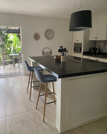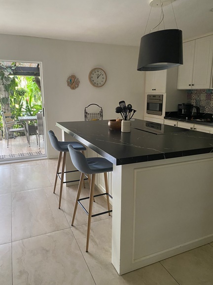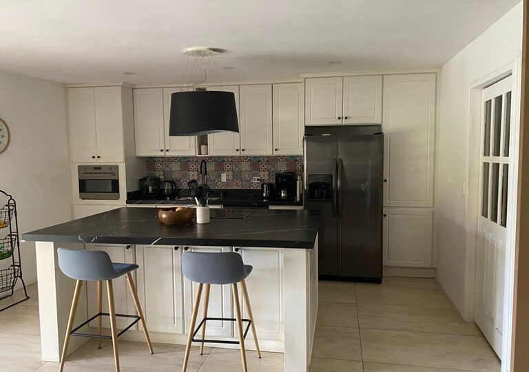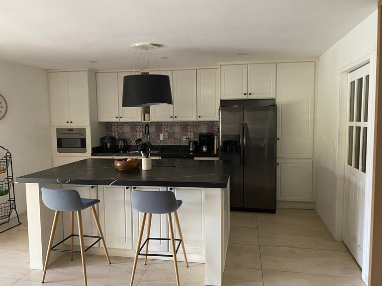 Cocina con isla y muebles de almacenamiento