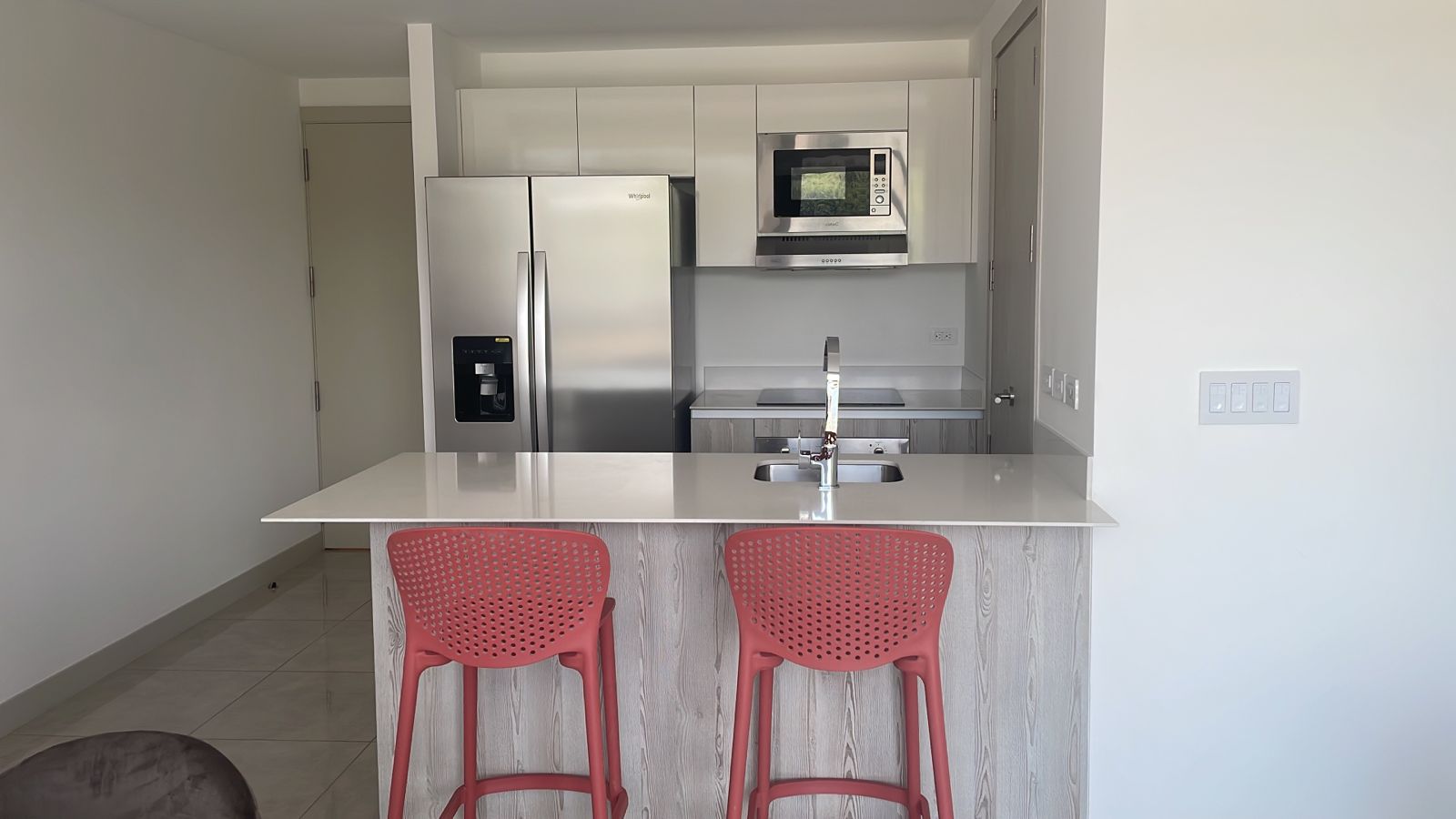 Posee área social con sala comedor y cocina de concepto abierto, balcón, dos dormitorios y dos baños. El dormitorio principal con A/C, walk-in closet y baño.