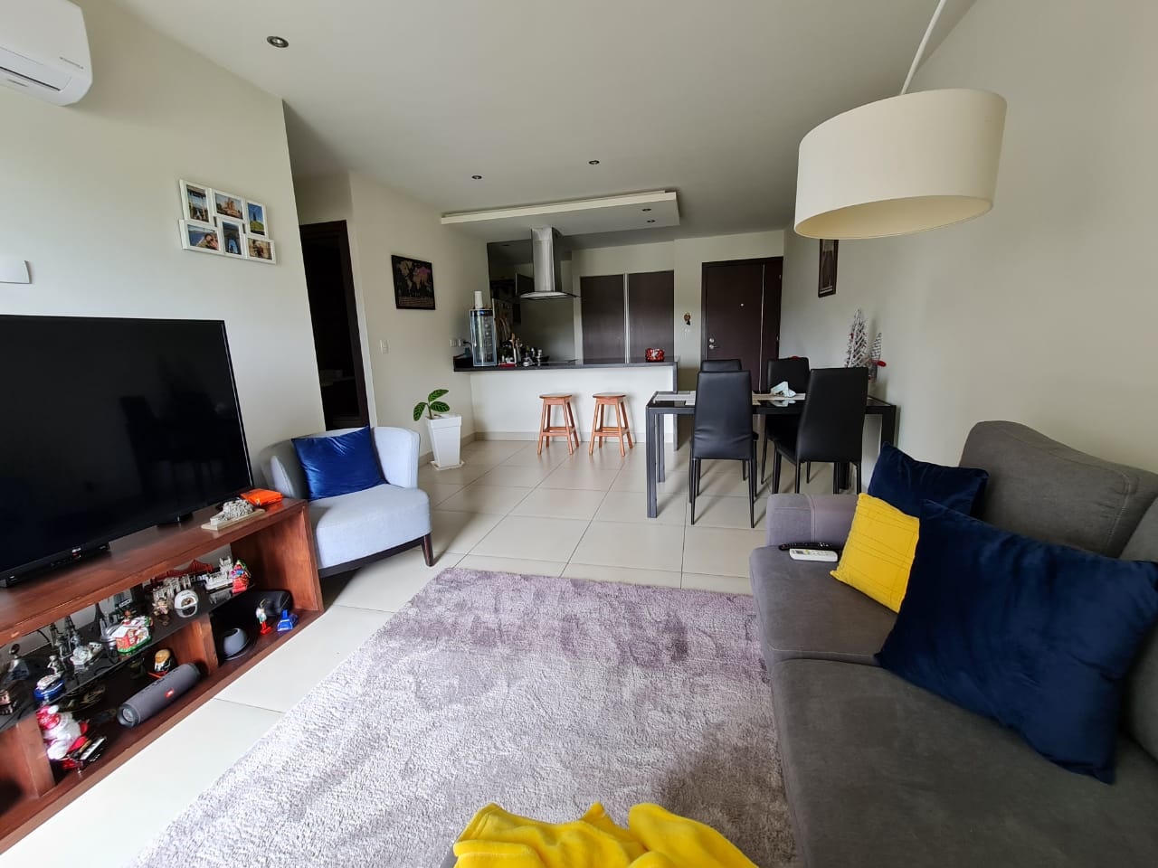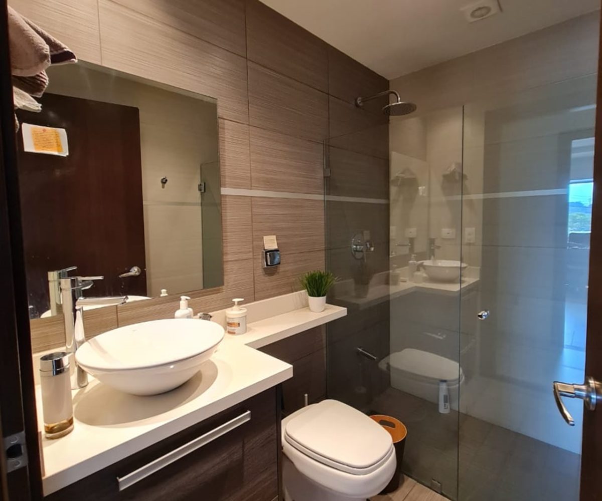 El apartamento cuenta con finos acabados (pisos de porcelanato, luminaria, grifería, espejos, puertas de vidrio temperado en baños) y materiales de construcción de primera calidad, además de áreas muy bien distribuidas para mayor aprovechamiento de espacios. Ofrece área social con balcón y mucha luz natural, cocina de concepto abierto con desayunador y estufa, área de lavandería, 2 cómodos dormitorios y 2 baños completos, el dormitorio principal con walk in closet y baño privado, además de 2 espacios de estacionamiento y 1 bodega. Incluye 2 A/C y persianas tipo “black out” en dormitorios y sala.