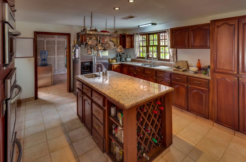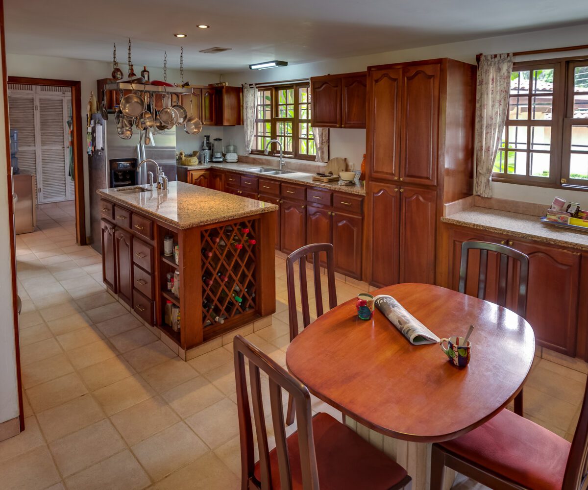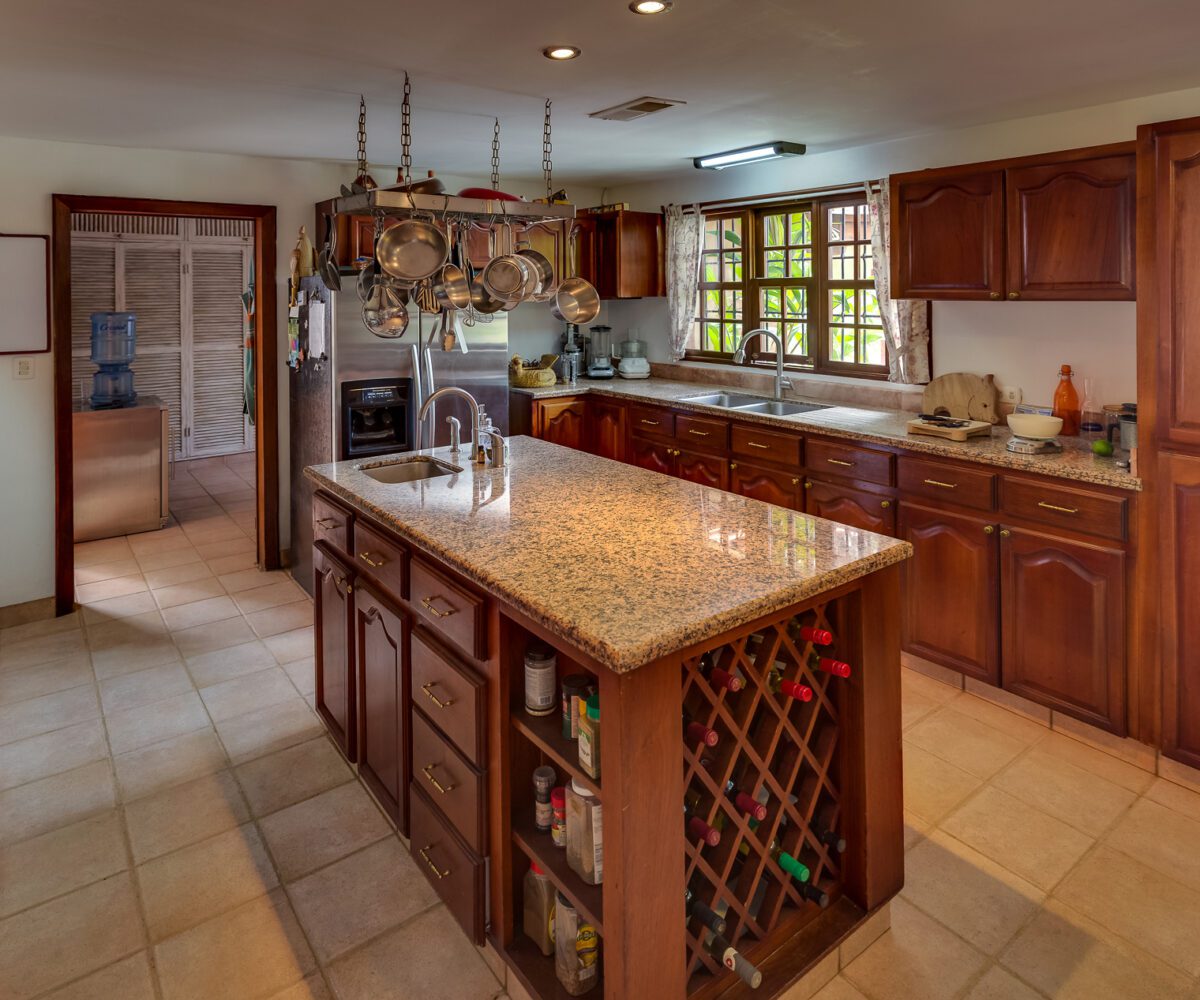 – En el ala derecha se encuentra la amplia cocina con sobres de granito y gabinetes de maderas finas. Al lado está el cuarto de lavandería y la habitación de servicio con su baño.