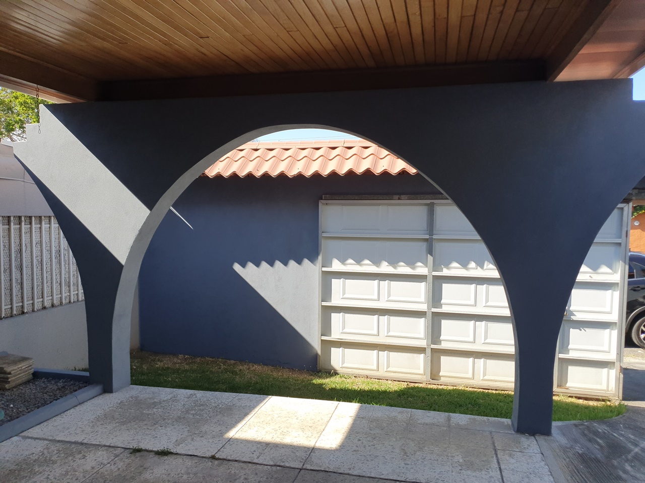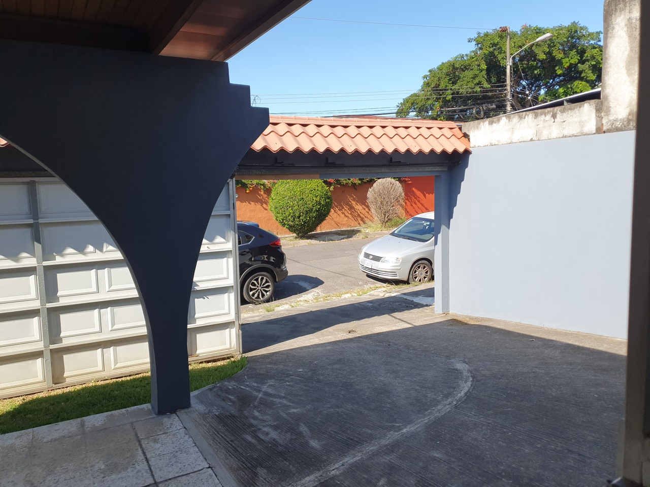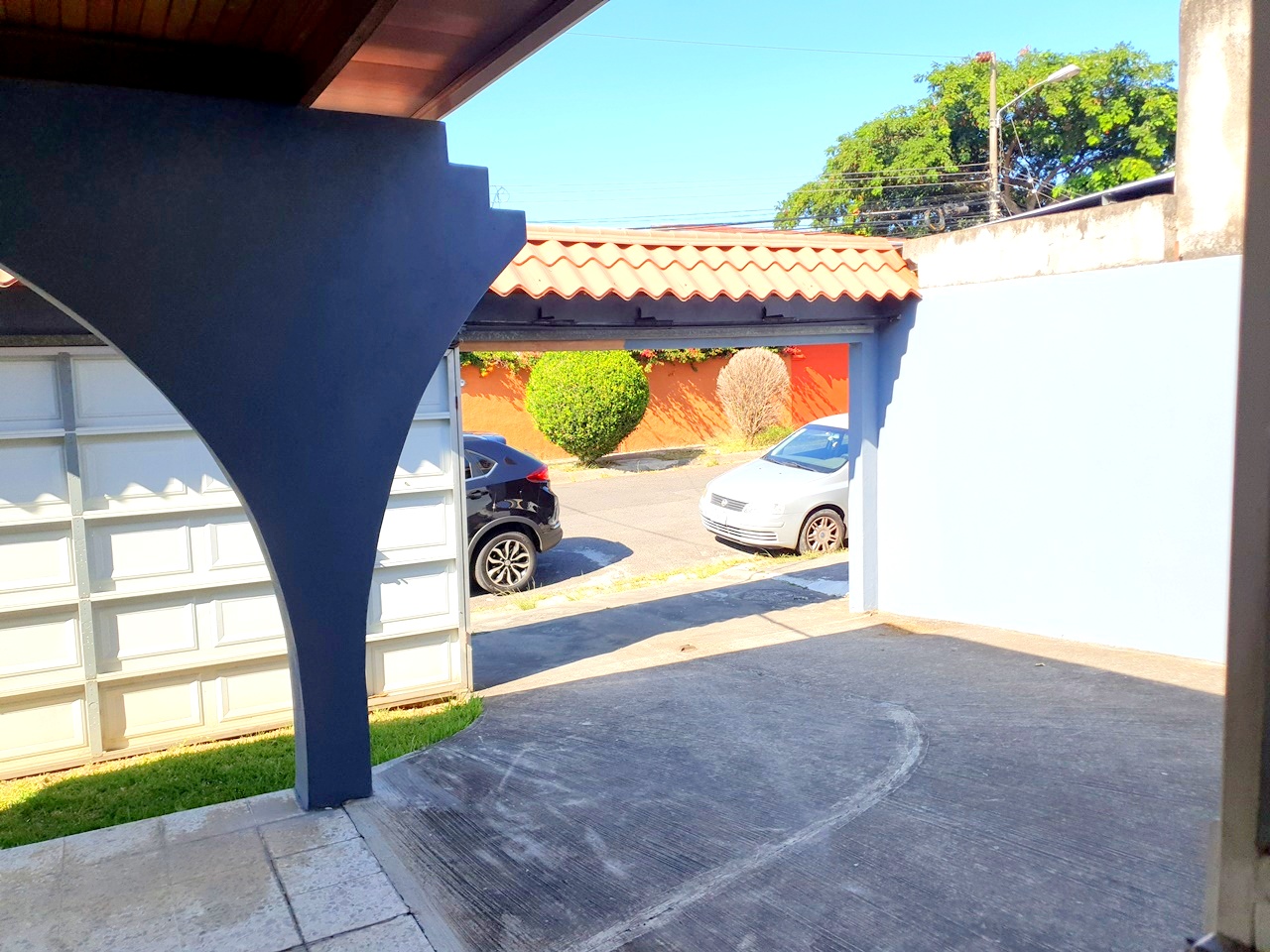 La cochera para 2 carros bajo techo y parqueo para 2 carros más.