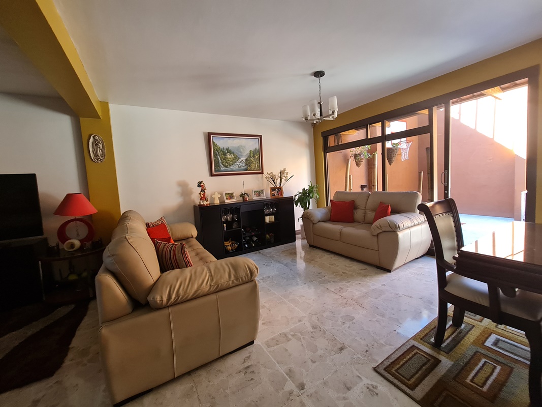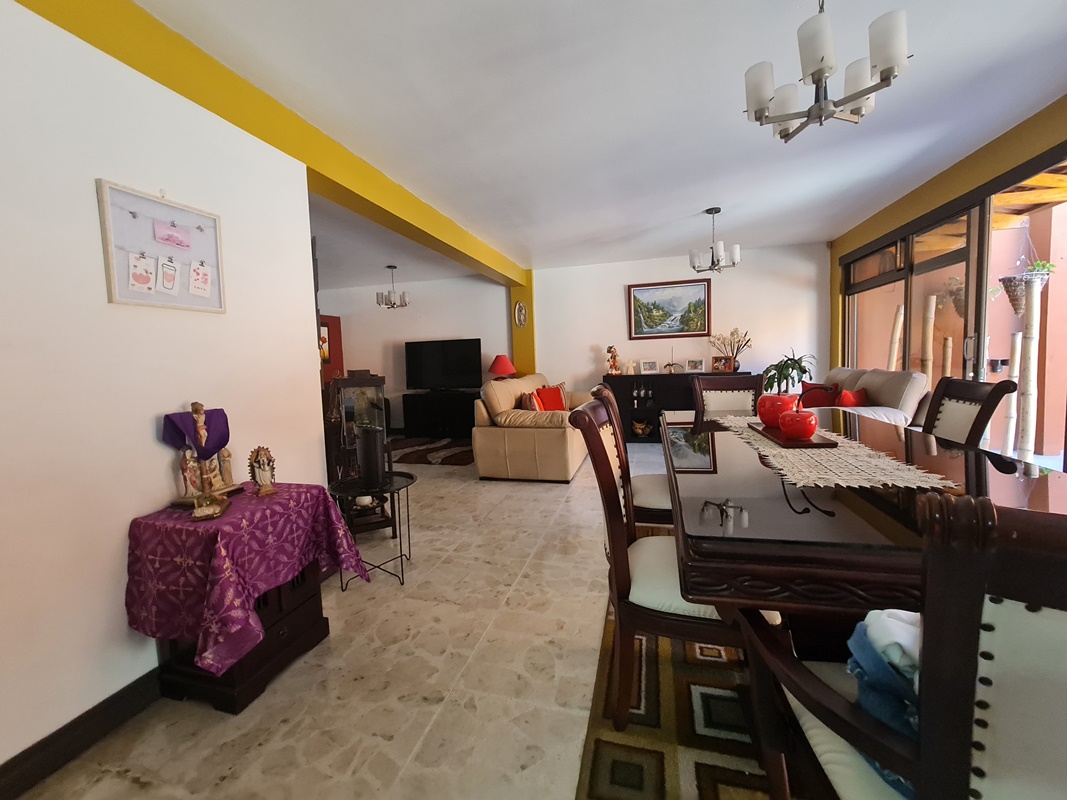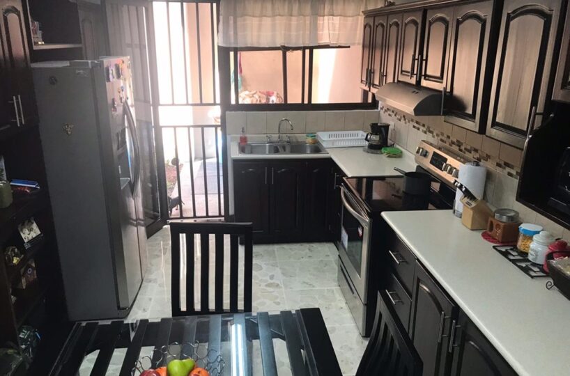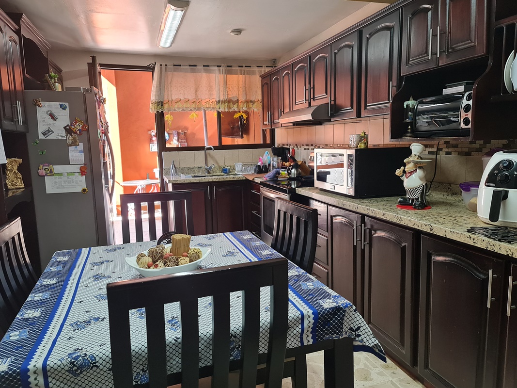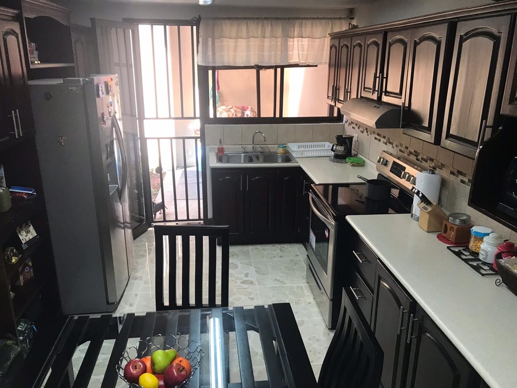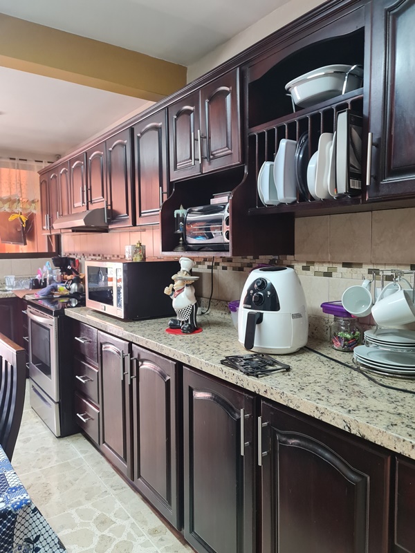 Sala comedor, cocina independiente con muebles finos de madera y sobres en granito.