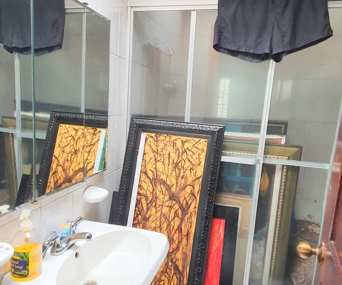 Downstairs the garden, there is a large office, playroom space or in this case the most interesting area for an artist.