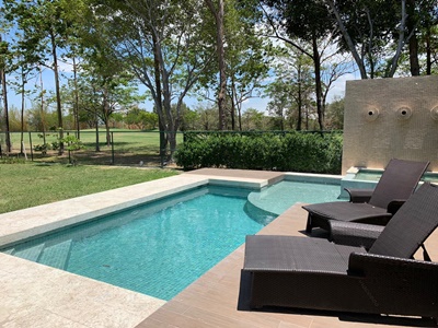 Esta preciosa casa cuenta con 770m2 de construcción con acabados de lujo y materiales de primera calidad óptimamente distribuida en dos plantas, en un lote de 900m2 y se encuentra ubicada frente al campo de golf. Consta de una amplia y elegante área social con pisos de mármol turco, una preciosa cocina con sobres de cuarzo y desayunador, amplísimas terrazas y área de BBQ. Cuenta además con cuarto y baño de servicio, área de lavandería, suficiente espacio para almacenamiento, parqueo bajo techo para 2 vehículos y 2 bodegas. Adicionalmente posee 5 amplios dormitorios, cada uno con A/C tipo mini-split (aire acondicionado de bajo consumo) y 5 baños completos, sala de estar con Home Theater. Ofrece un hermoso e impecable jardín con sistema de riego automático, piscina y jacuzzi. PARA LA VENTA: $1.500.000